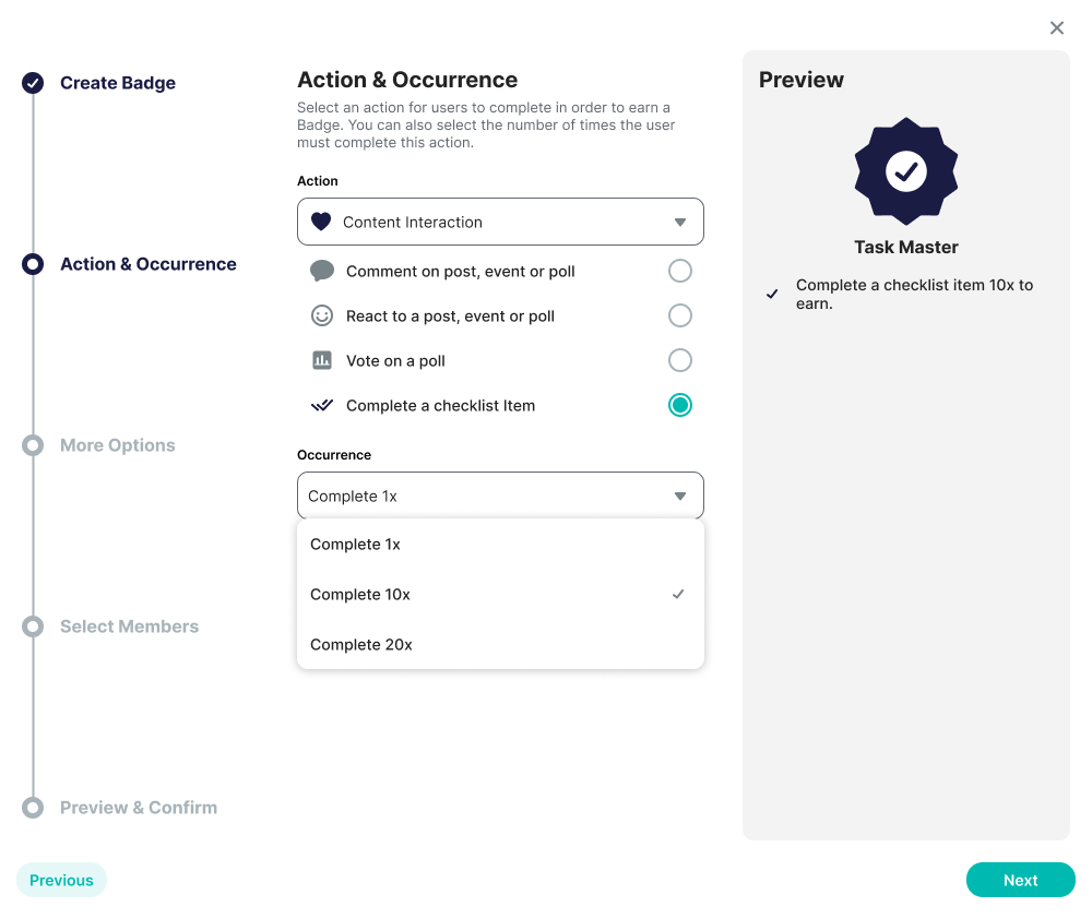 Modify occurrence thresholds or badge actions (e.g., check-in to an event 10x).
