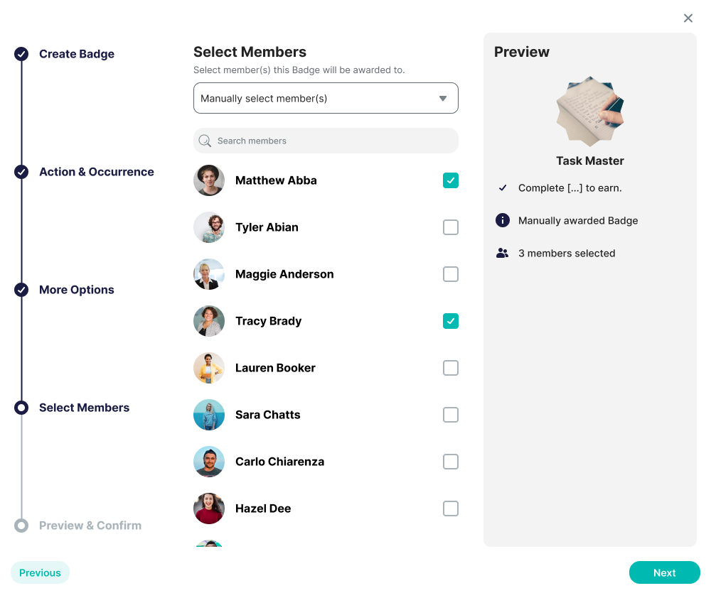 Individual Selection (EXCLUSIVE TO MANUAL BADGES): Assign Badges directly to specific users.